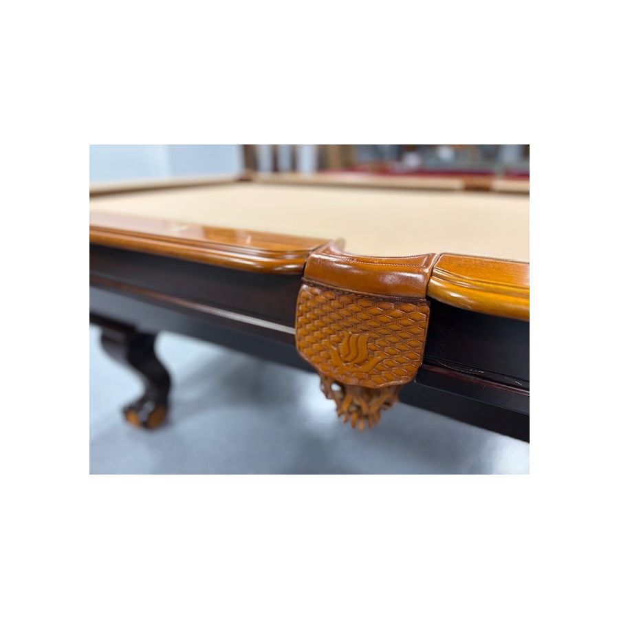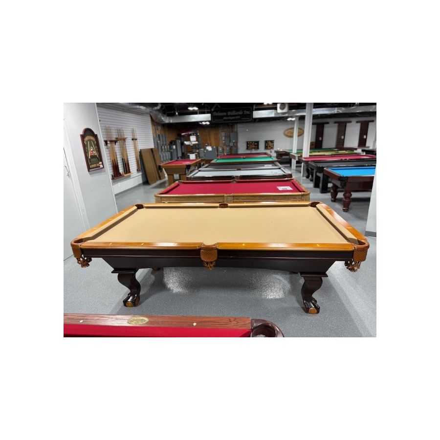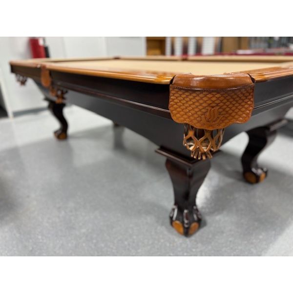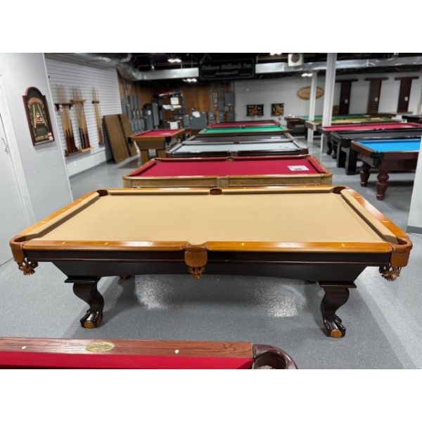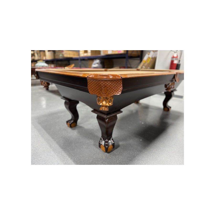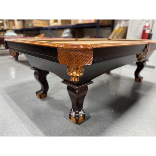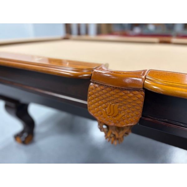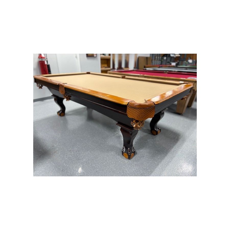 Table de billard usagée 8 pieds 2-tons Chêne et Noyer avec pattes boules et griffes munie d'ardoise naturelle TABLE558NN8P Fabriquée avec bois massif et bois d'ingénierie avec fini 2 tons Chêne et Noyer ardoise naturelle 1 pouces, poches en cuir véritable, tapis Championship Invitational Beige muni de protection anti-taches.