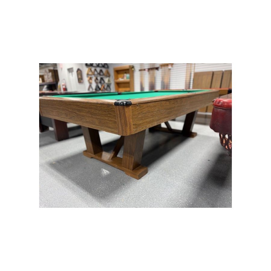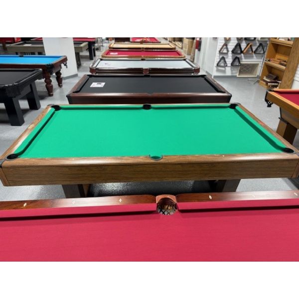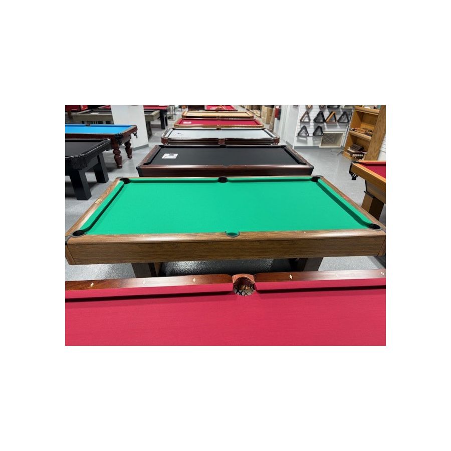 Fabriquée en bois d'ingénierie fini extérieur en Arborite très durable simili bois Brun Fonçé, pattes en piédestal, ardoise naturelle 1 pouce, poches encastrée, tapis vert. Inclut une garantie d'un an et une trousses d'accessoires usagés.