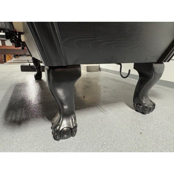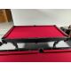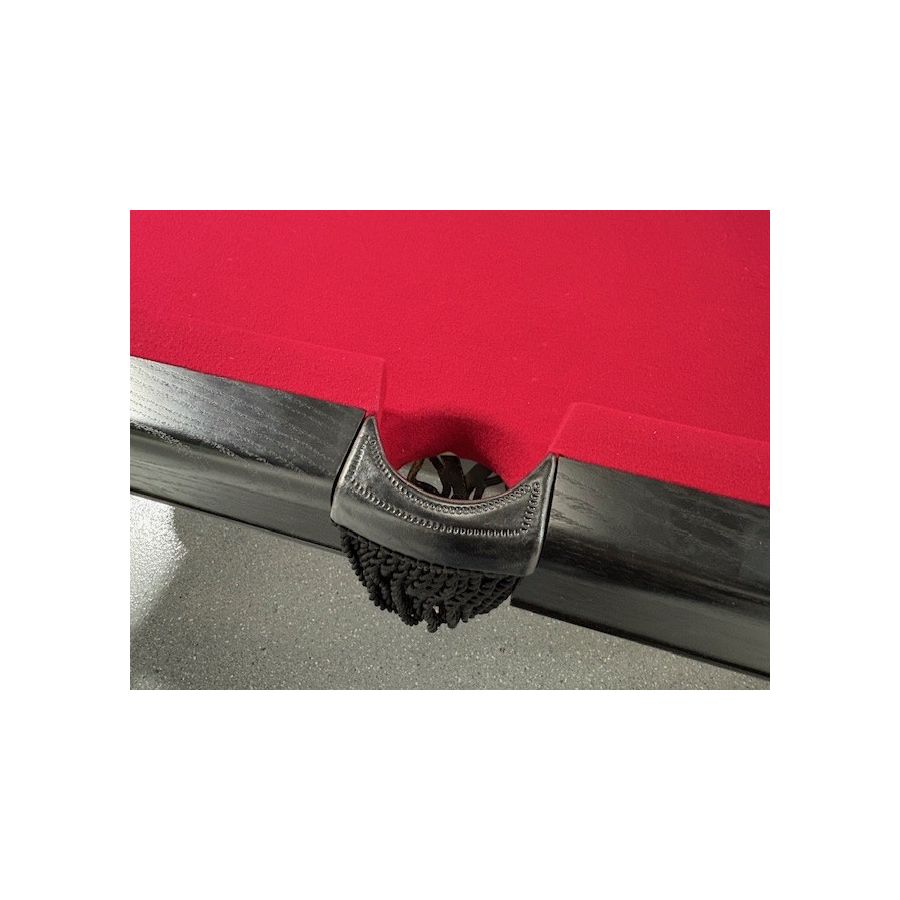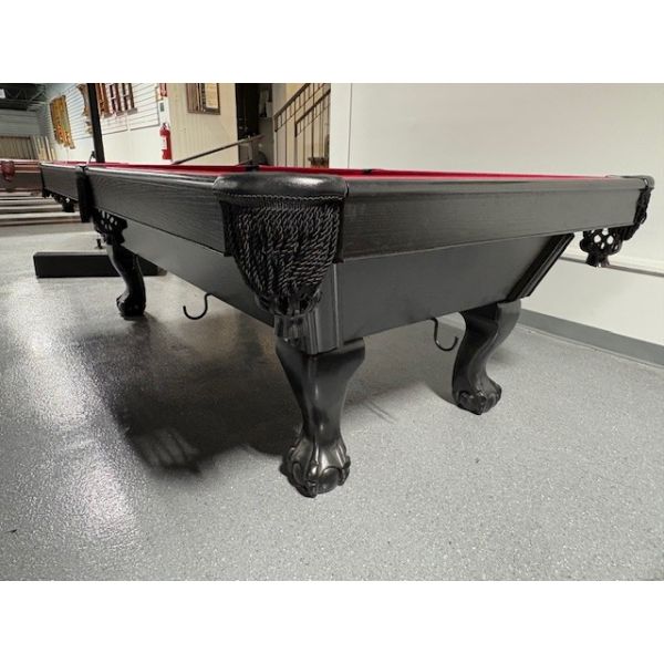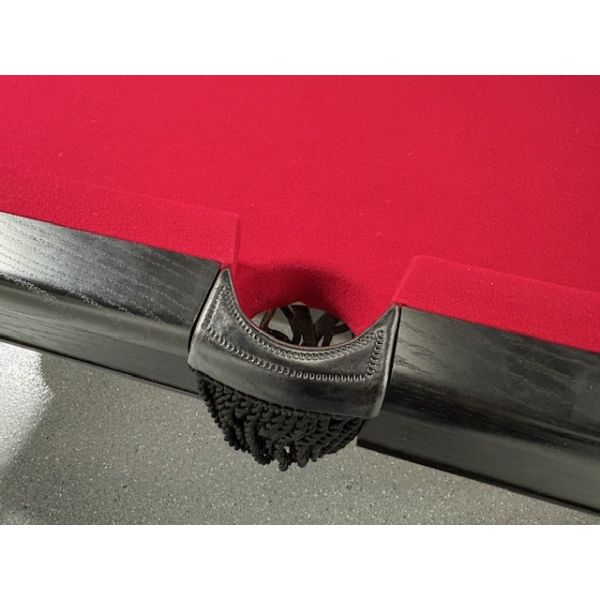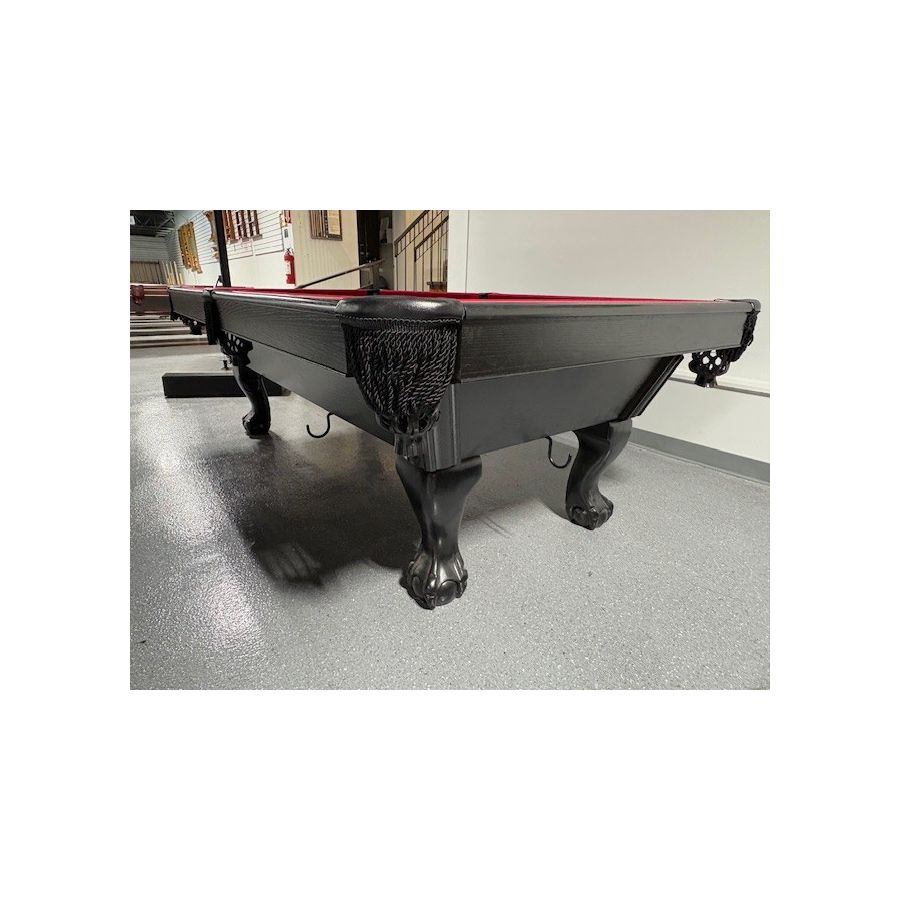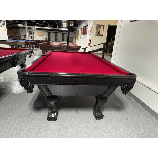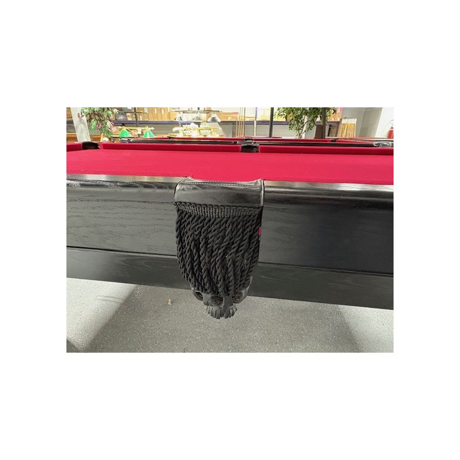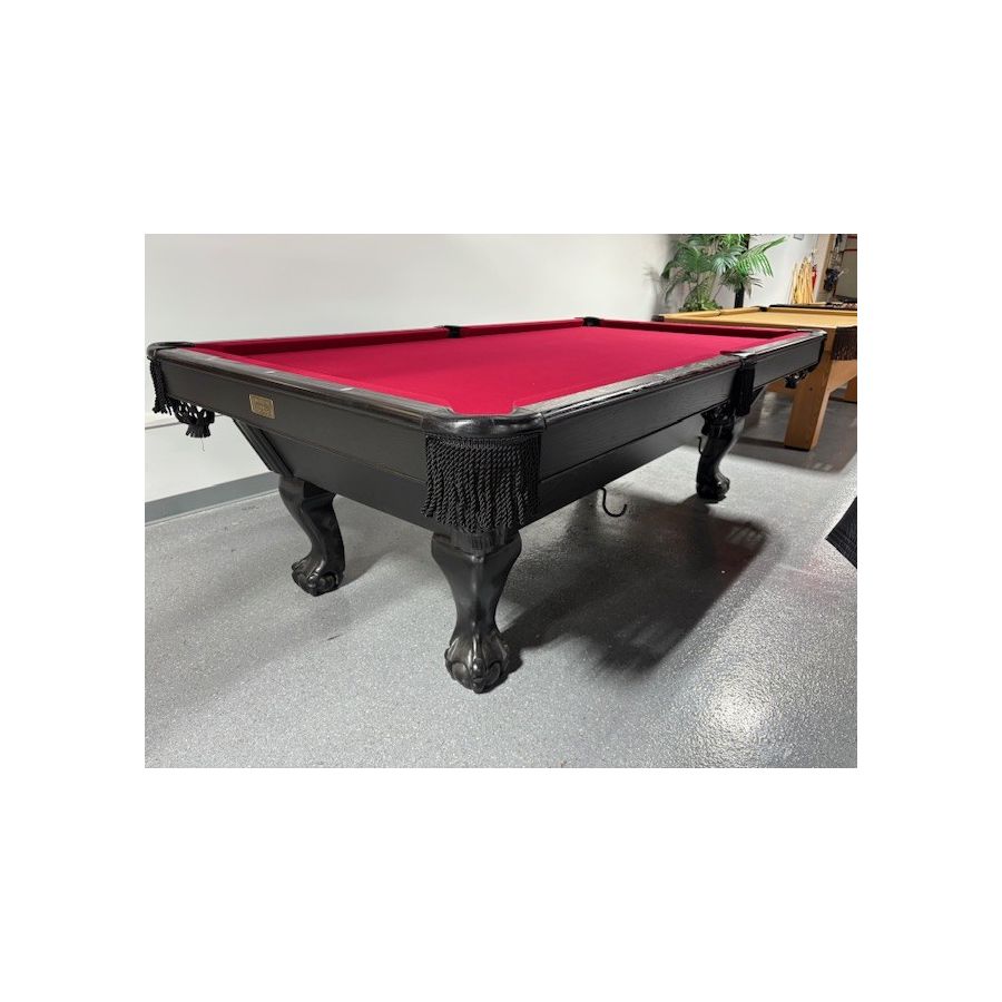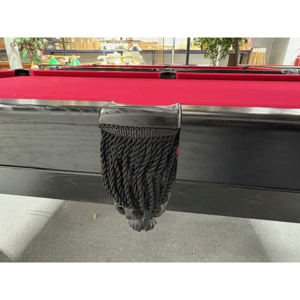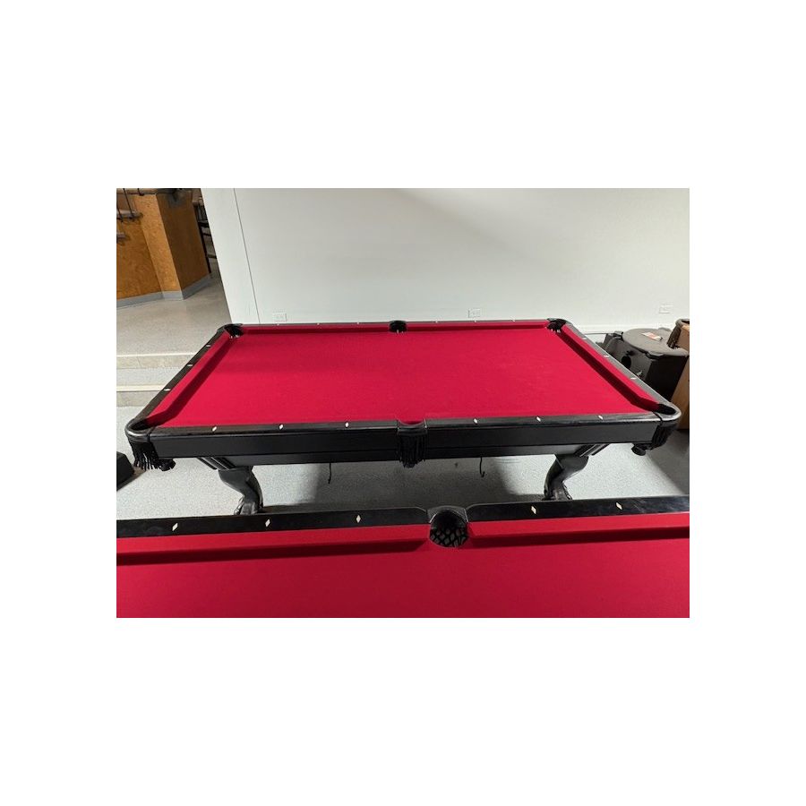 Table de pool usagée 8 pieds Canada Billard en bois massif de teinte noir et ardoise naturelle Code : TABLE551CBB8P Fabriquée en bois massif, poches en cuir véritable, tapis neuf Championship Invitational Rouge muni de protection anti-taches.