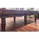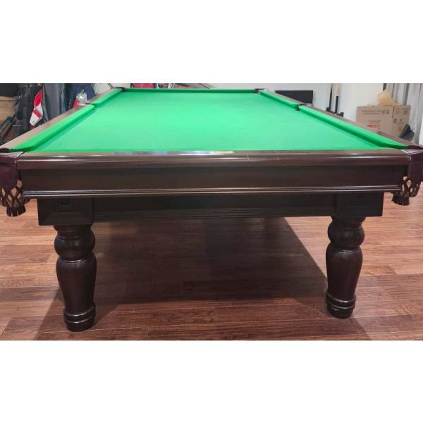 Fabriquée en bois massif fini Acajou, ardoise naturelle, poches en cuir véritable et un tapis de Billard de qualité Hainsworth tissé en Angleterre.