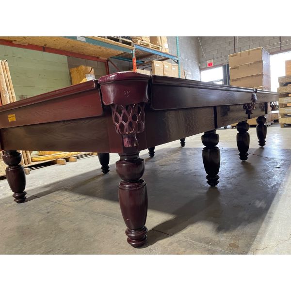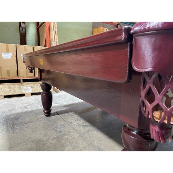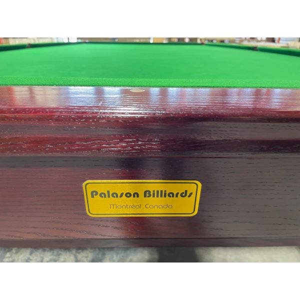 Fabriquée majoritairement en bois de Chêne massif et structure en bois stratifié, ardoise en 5 morceaux de 1-1/2'' d'épaisseur, 8 pattes tournées en bois massif, bandes de caoutchouc neuves, poches en cuir véritable et tapis de rapide 100% Laine de compétition professionnelle Hainsworth importé d'Angleterre. Inclut une garantie d'un an Palason. Cette table est démonté et présentement à notre entrepôt de Lachine QC, mais vous pouvez communiquer avec notre magasin le plus proche pour de plus amples détails et une soumission détaillée pour installation et options.